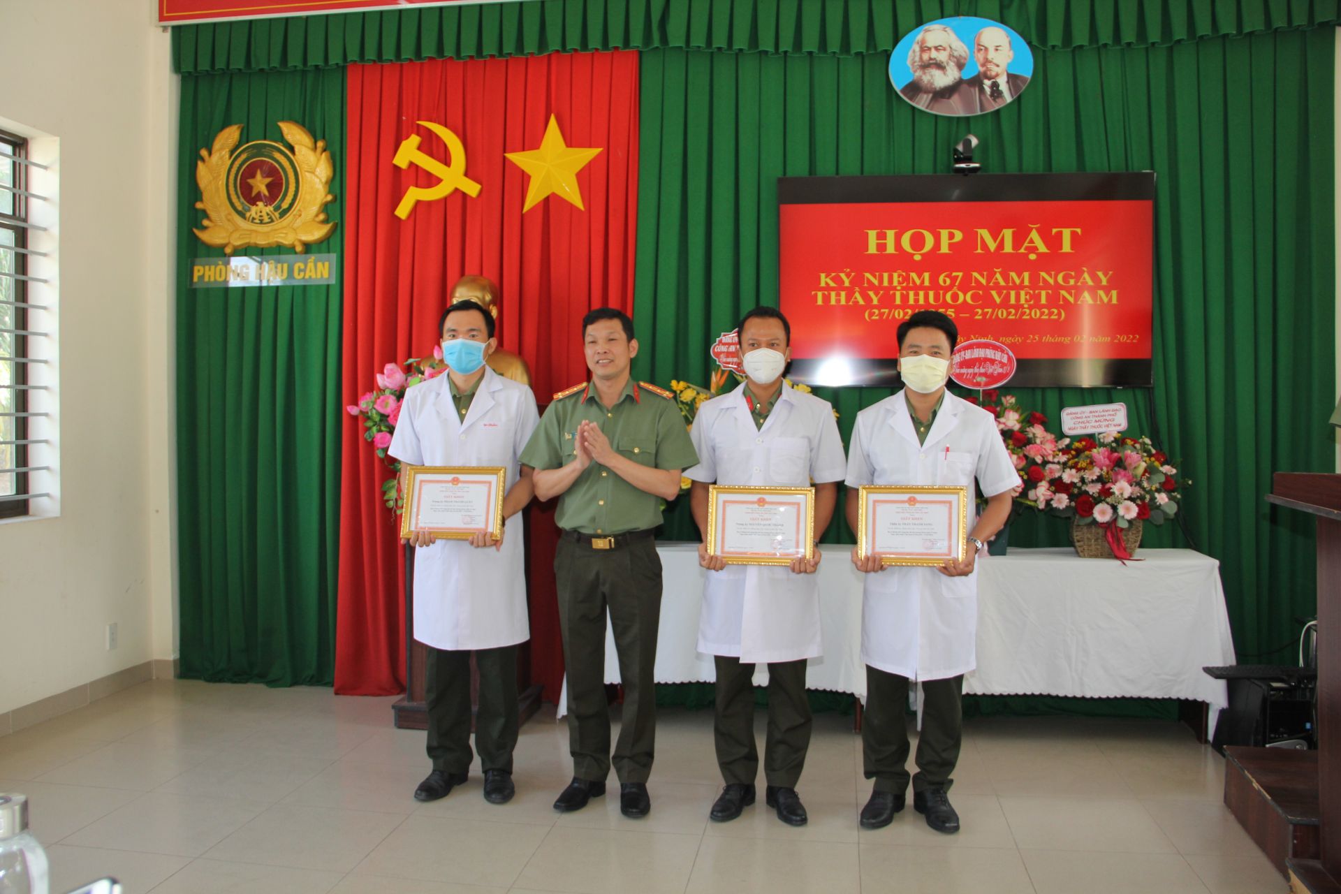 Thay mặt Ban Giám đốc Công an tỉnh, Phó Giám đốc Công an tỉnh Tạ Văn Đẹp tặng giấy khen cho 1 tập thể, 7 cá nhân có thành tích xuất sắc trong đợt thi đua kỉ niệm 67 năm Ngày Thầy thuốc Việt Nam (27.2.1955 – 27.2.2022).