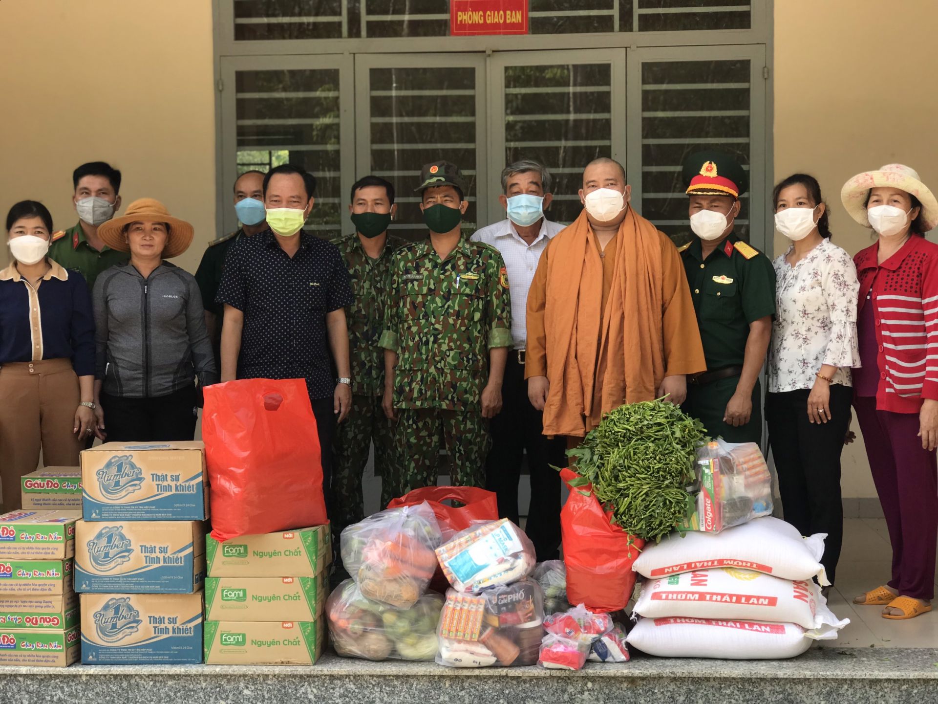 Những phần quà gồm gạo, nhu yếu phẩm, rau xanh do tịnh xá vận động phật tử đóng góp trao tặng cán bộ, chiến sĩ tại các chốt phòng, chống dịch (trị giá 20 triệu đồng).