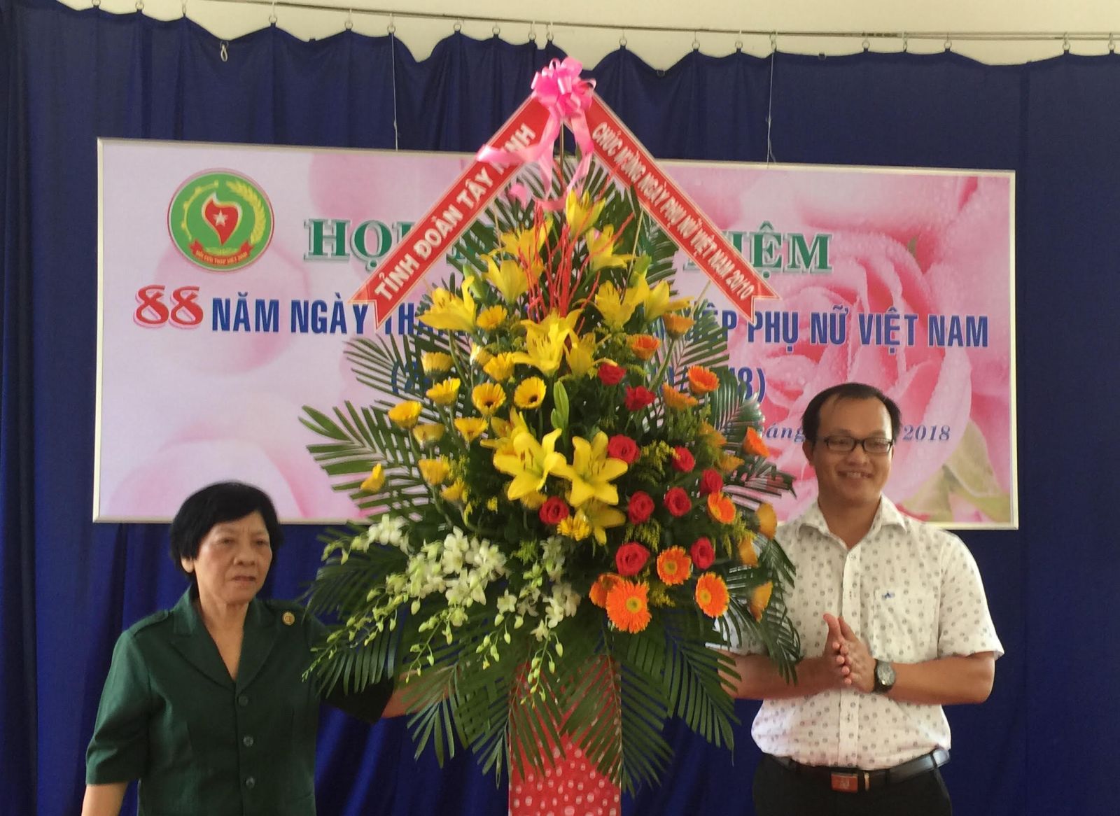 Phó Bí thư Tỉnh đoàn Võ Quốc Khánh tặng hoa chúc mừng Ngày Phụ nữ Việt Nam 20.10 cho bà Võ Mai Hồng, Uỷ viên Ban Thường vụ Tỉnh hội phụ trách công tác nữ cựu TNXP.