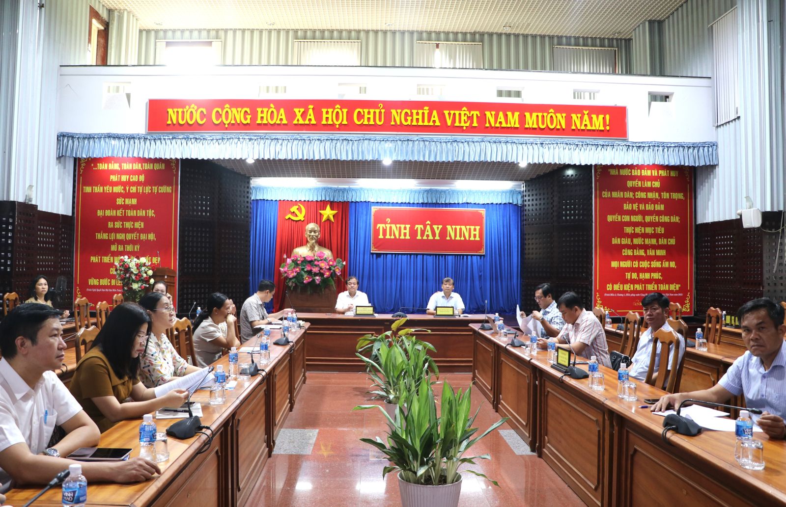Phiên họp được kết nối trực tuyến đến điểm cầu các tỉnh, thành phố trên cả nước. Quyền Chủ tịch UBND tỉnh Nguyễn Hồng Thanh và Chủ tịch UBMTTVN tỉnh Võ Đức Trong dự chủ trì tại điểm cầu UBND tỉnh.