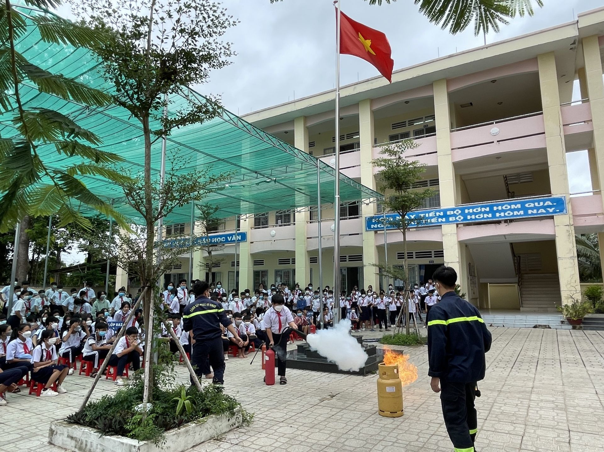 Cán bộ hướng dẫn học sinh thực hành cách dập lửa khi cháy bình gas.