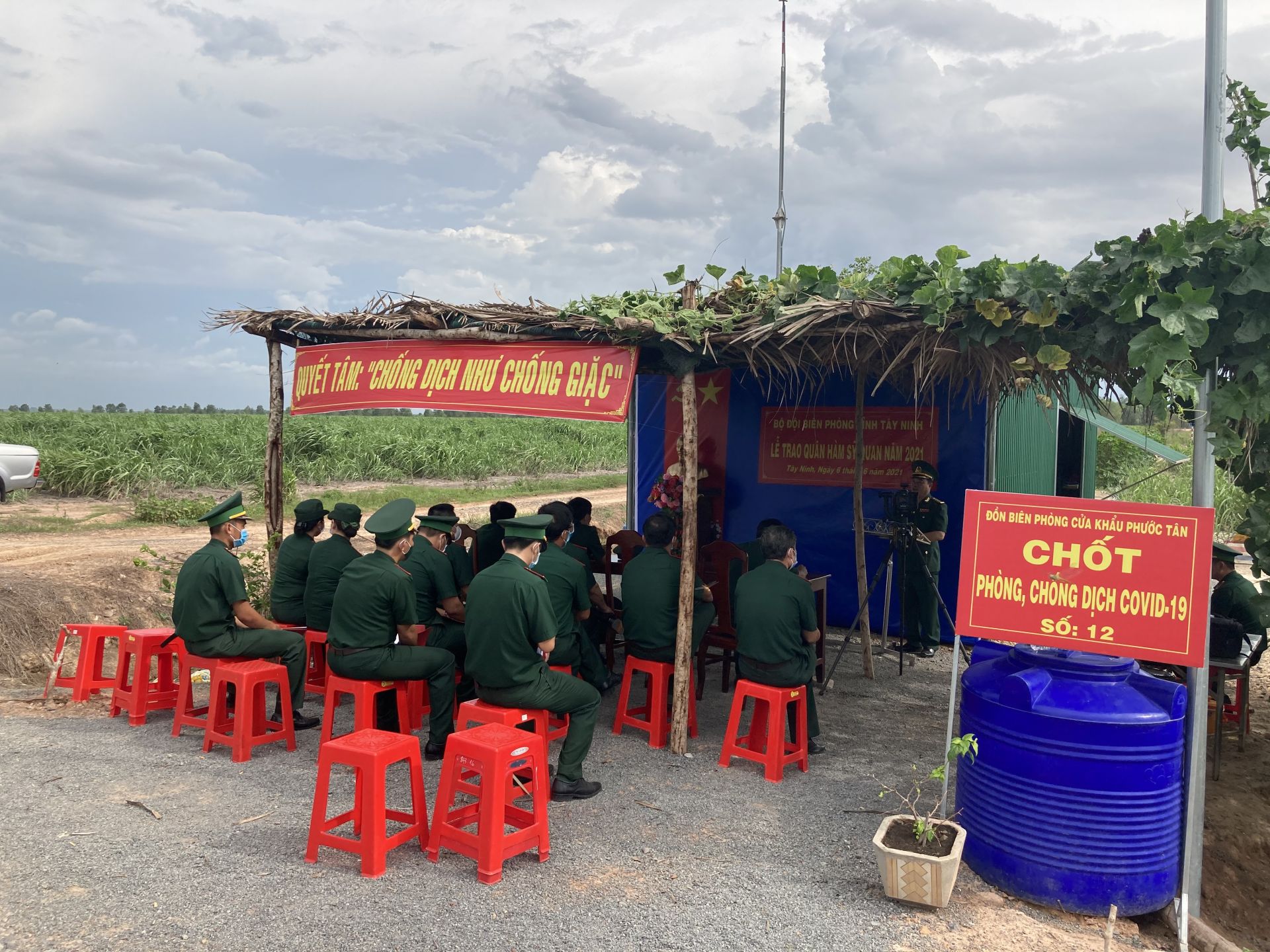 Quang cảnh buổi lễ trao quân hàm cho các sĩ quan đang thực hiện tại điểm chốt chống dịch số 12 thuộc Đồn BPCK Phước Tân.