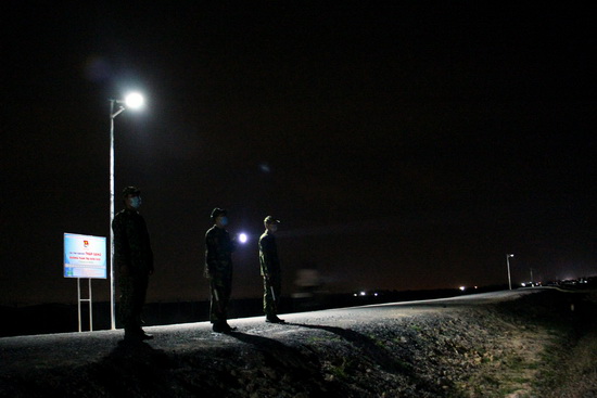 Các chiến sĩ tuần tra dọc đường biên giới dưới ánh đèn năng lượng mặt trời tại điểm chốt Cầu Trắng.