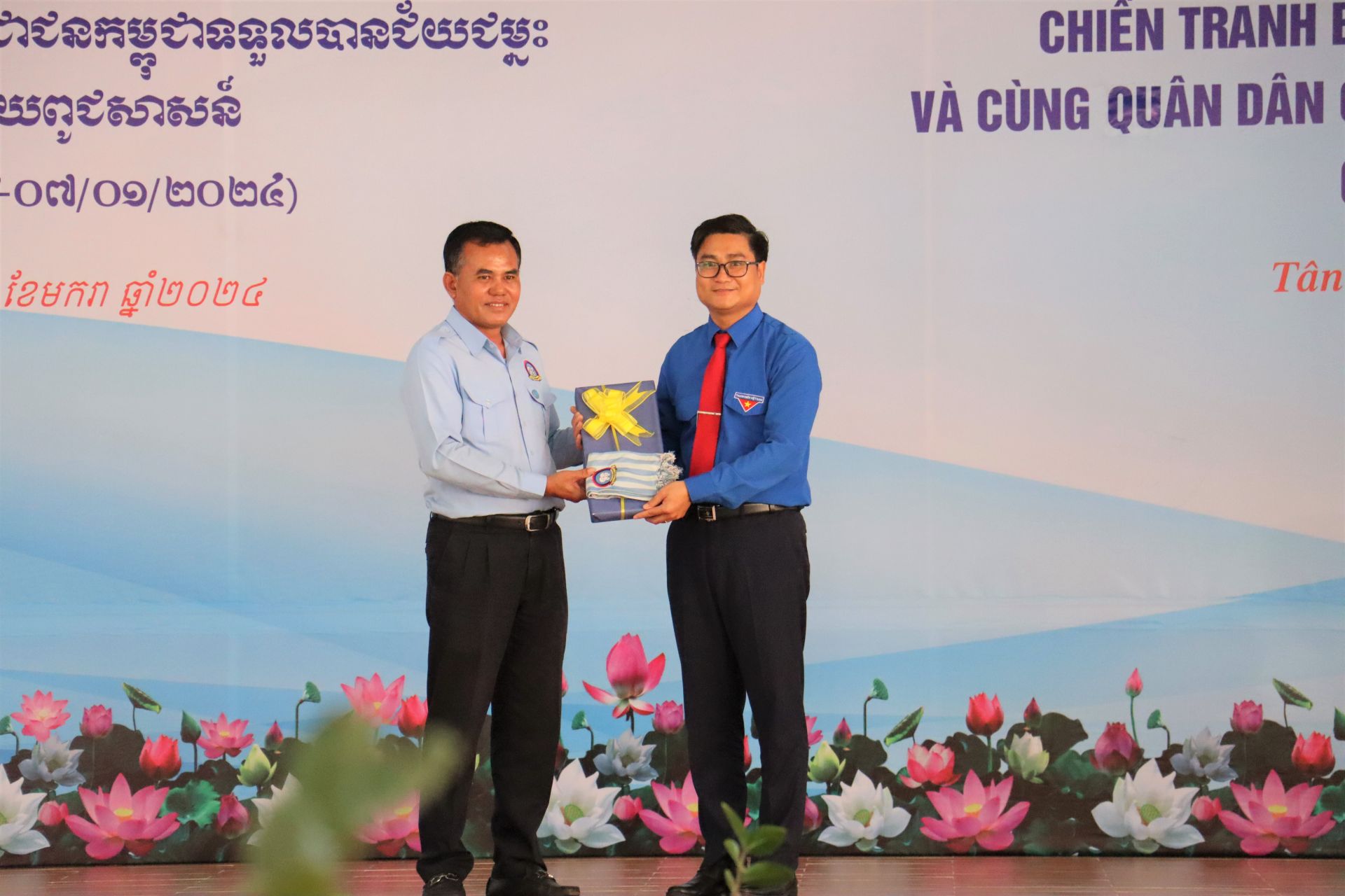Ông Mao Dung, Phó Tỉnh trưởng, Chủ tịch Hội Liên hiệp Thanh niên Campuchia tỉnh Tbong Khmum tặng quà lưu niệm cho anh Nguyễn Thanh Tùng – Bí thư Tỉnh đoàn Tây Ninh.