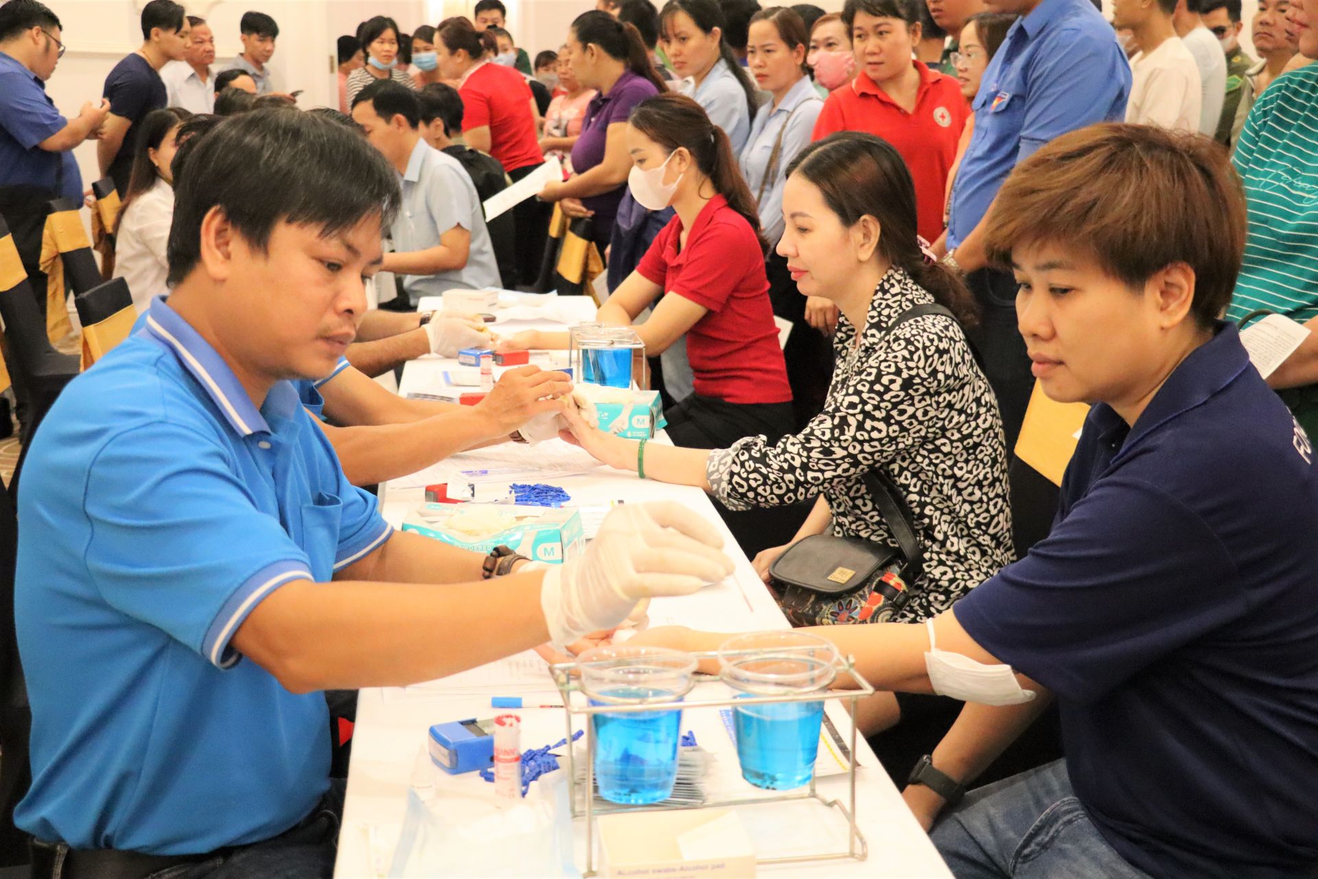 Nhân viên y tế kiểm tra máu cho tình nguyện viên.