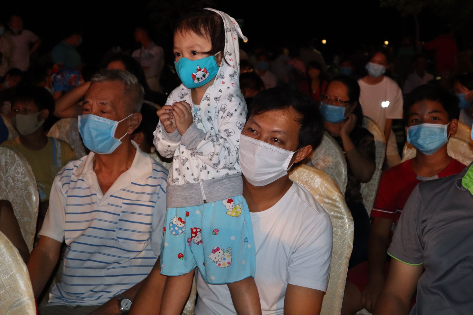 Các em nhỏ đều được ba mẹ trang bị khẩu trang khi đến dự lễ khai mạc Chợ hoa Xuân.