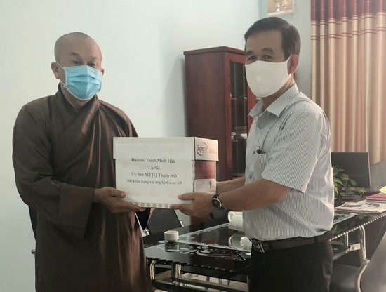 Ông Lê Thế Hiền-Trưởng ban Dân vận Thành ủy, Chủ tịch UB.MTTQVN Thành phố Tây Ninh tiếp nhận khẩu trang do đại diện cơ sở tôn giáo trao tặng.