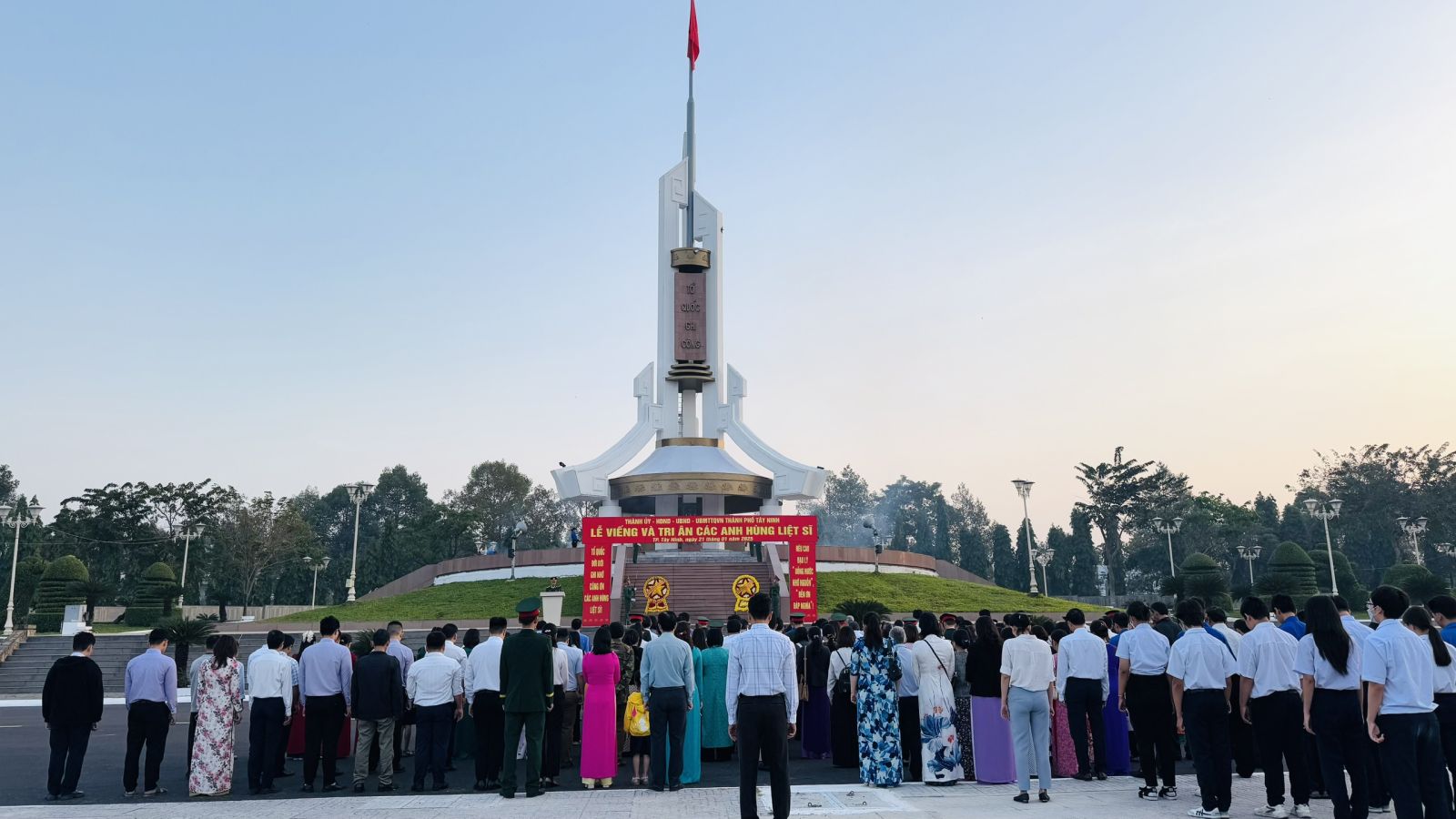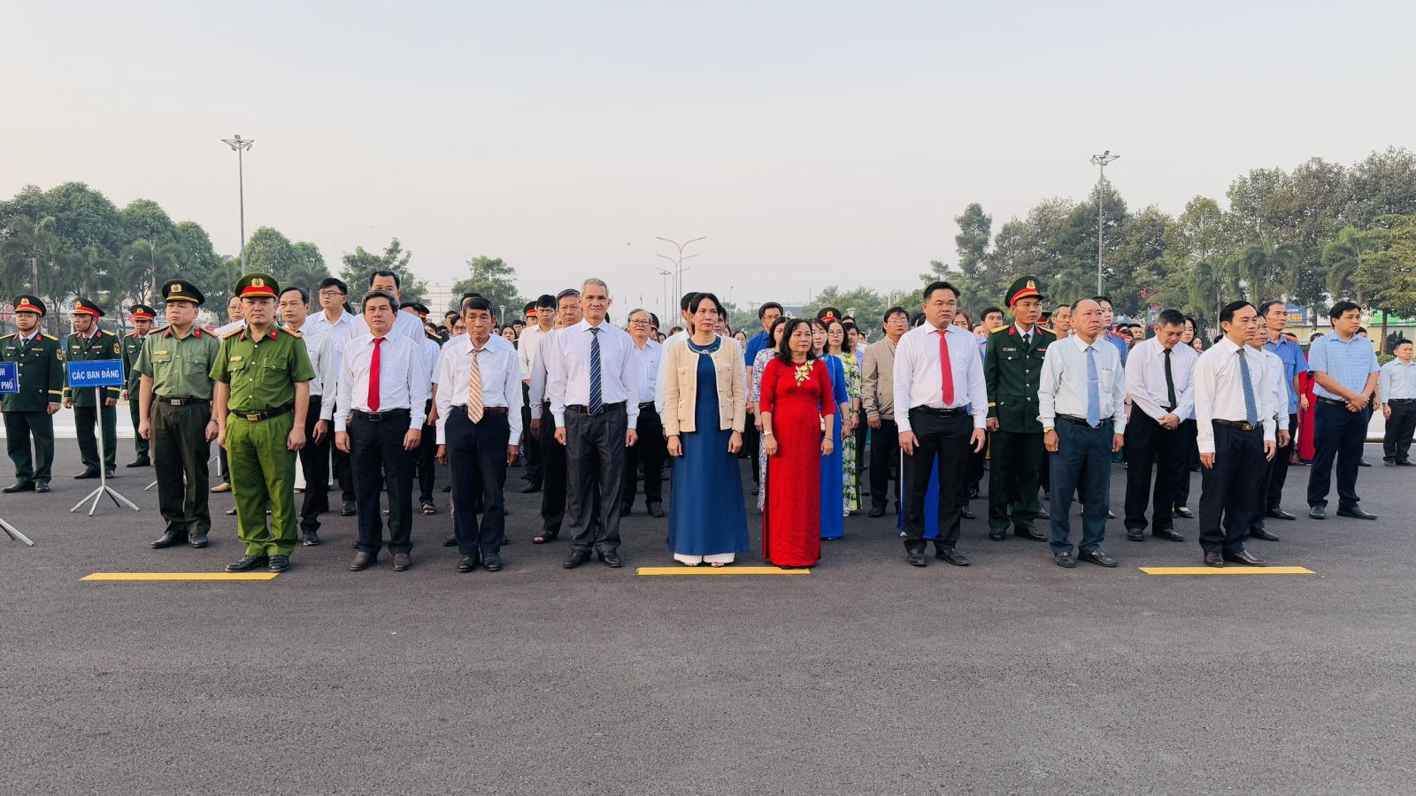 Tại đây, các đại biểu thành kính dâng tràng hoa tươi thắm lên Đài tưởng niệm các anh hùng, liệt sĩ; dành một phút mặc niệm để tưởng nhớ đến Chủ tịch Hồ Chí Minh, đồng bào chiến sĩ, các anh hùng liệt sĩ, những người con ưu tú của đất Việt đã chiến đấu quên mình vì độc lập của Tổ quốc.