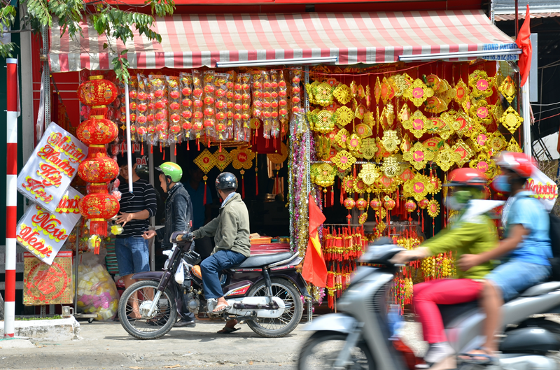 Các vật phẩm trưng bày trong dịp Tết được bày bán trên đường phố, trong chợ.