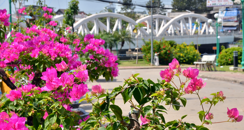 Hoa giấy đỏ rực trong nắng trưa ở Công viên Thắng Lợi, khu vực cặp bờ kè rạch Tây Ninh.