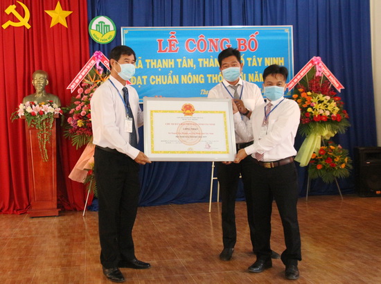Trao bằng công nhận xã nông thôn mới cho lãnh đạo xã Thạnh Tân.