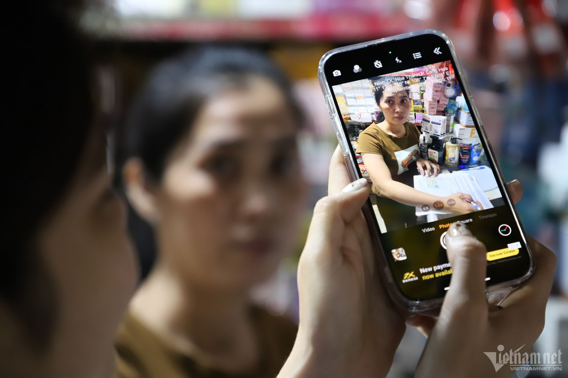 Nhân viên ngân hàng chụp lại ảnh chân dung của tiểu thương trong quá trình làm thủ tục cấp mã QR-Code. "Trước đó, nhiều khách hàng đi chợ Long Hoa thường hỏi tôi có mã thanh toán không dùng tiền mặt hay không. Nếu có, mọi người sẽ chọn thanh toán online thay vì trả tiền mặt như trước kia. Được hỗ trợ tạo QR-Code, việc thanh toán, làm ăn của tôi thuận lợi hơn trước nhiều", chị Trương Thị Sa nói.