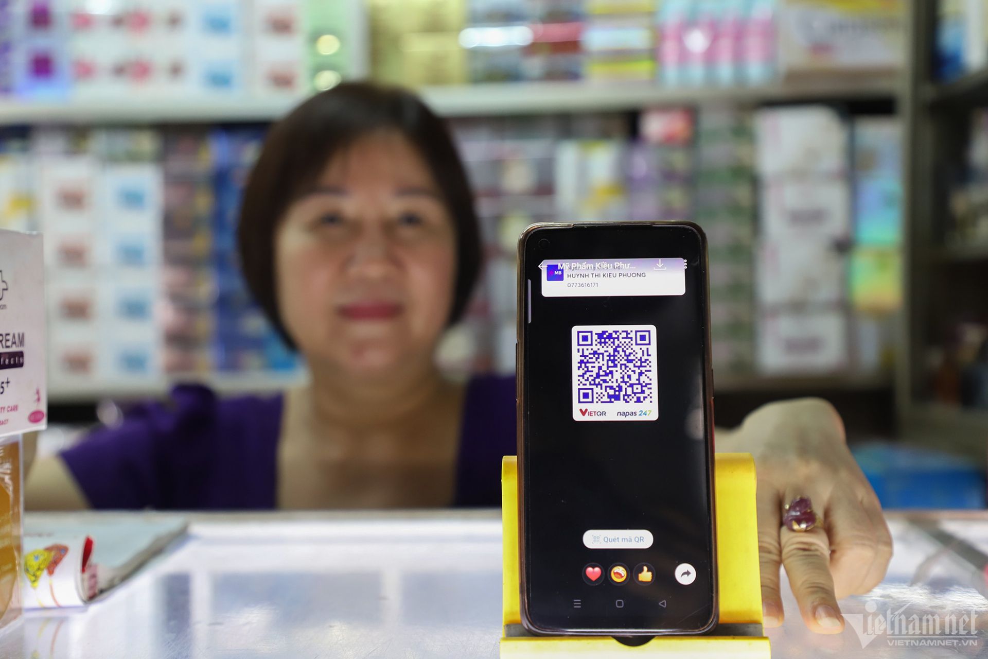 "Mỗi ngày có hàng chục khách chọn thanh toán không dùng tiền mặt tại cửa hàng. Việc giao dịch được thực hiện nhanh chóng, chỉ khoảng 30 giây, tiện lợi hơn so với trước", tiểu thương Huỳnh Thị Kiều Phương chia sẻ.