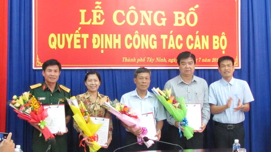 Trao quyết định Tỉnh ủy Tây Ninh chỉ định bổ sung Ủy viên Ban chấp hành Đảng bộ Thành phố Tây Ninh nhiệm kỳ 2015-2020 cho các đồng chí Nguyễn Ngọc Thành- Bí thư Đảng ủy phường 1, Đinh Thị Dương Thúy- Chủ tịch Liên đoàn Lao động Thành phố và thượng tá Nguyễn Quang Nhất- Chính trị viên Ban Chỉ huy Quân sự Thành phố.