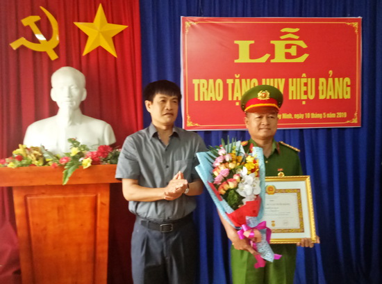Ông Thành Từ Dũ- Phó Bí thư Thường trực Thành ủy Tây Ninh trao Huy hiệu 30 năm tuổi Đảng cho Trưởng CATP Trần Văn Luận.