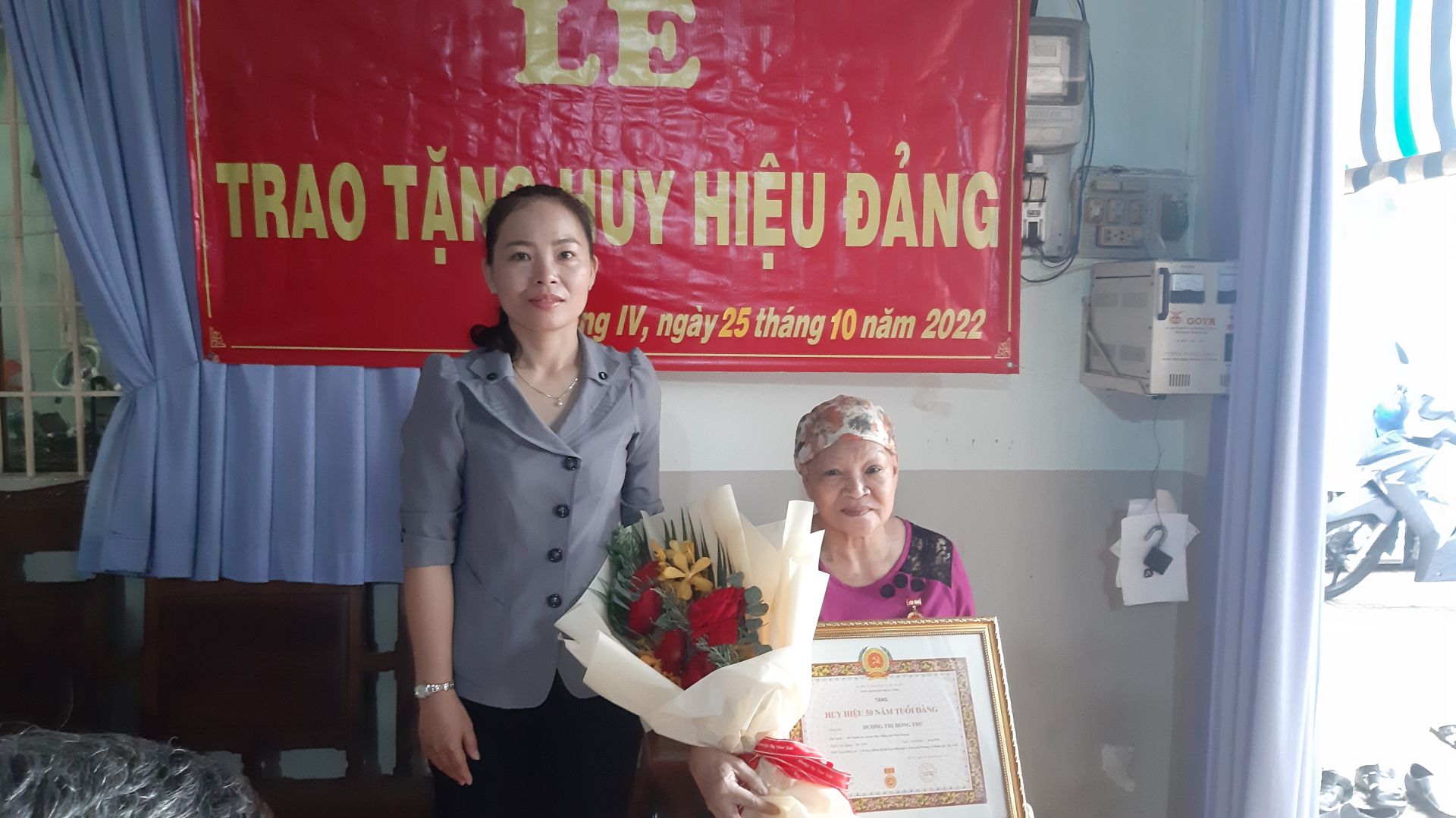Sáng 25.10, bà Nguyễn Thị Hồng Loan- Phó Bí thư Thường trực Thành uỷ cùng lãnh đạo Đảng uỷ phường IV đến nhà riêng trao Huy hiệu 50 tuổi Đảng cho đảng viên Dương Thị Hồng Thu.