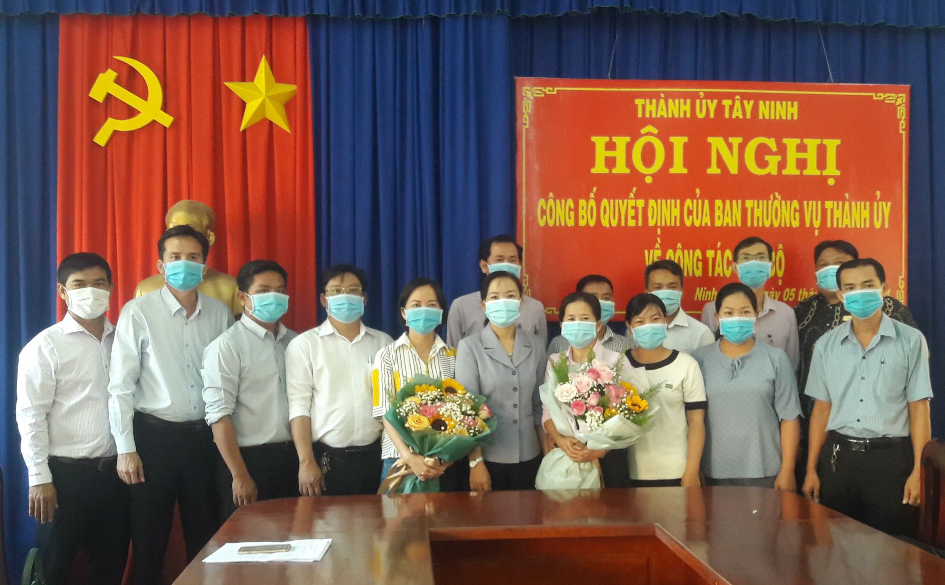 Bà Nguyễn Thị Hồng Loan-Phó bí thư Thường trực Thành ủy Tây Ninh trao tặng huy hiệu cho đảng viên.