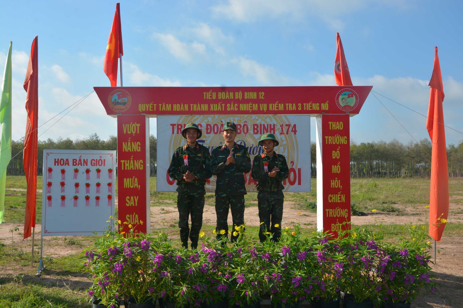 Những khẩu hiệu, cờ hoa, băng rôn cổ động với nội dung “Bình tĩnh, tự tin, quyết tâm bắn giỏi”, “Thao trường đổ mồ hôi, chiến trường bớt đổ máu”, “Cán bộ, chiến sĩ Tiểu đoàn 12, Trung đoàn 174 quyết tâm hoàn thành xuất sắc nhiệm vụ 3 tiếng nổ”… như tiếp thêm sức mạnh cổ vũ, động viên bộ đội thi đua giành kết quả cao nhất.