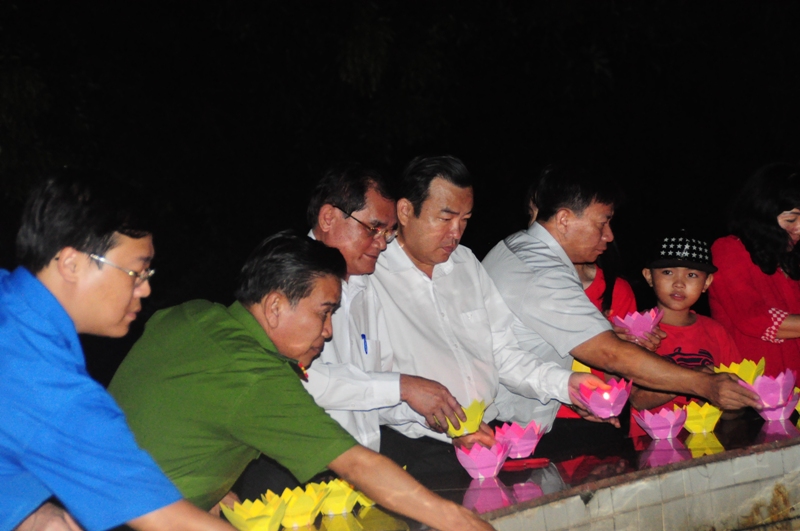| Các đại biểu Trung ương và Tây Ninh thả hoa đăng tưởng niệm các anh hùng liệt sĩ tại Nghĩa trang liệt sĩ Quốc gia Đồi 82. |