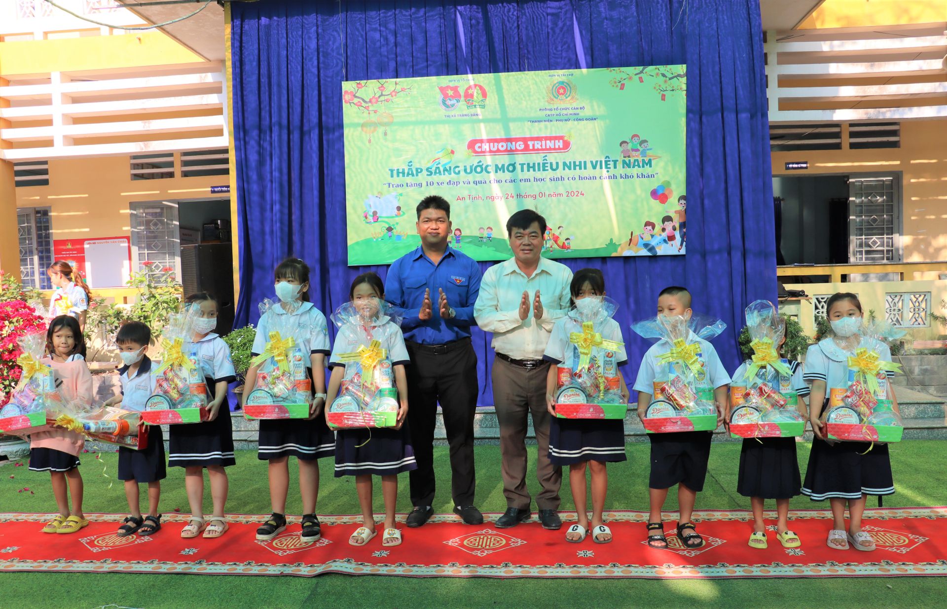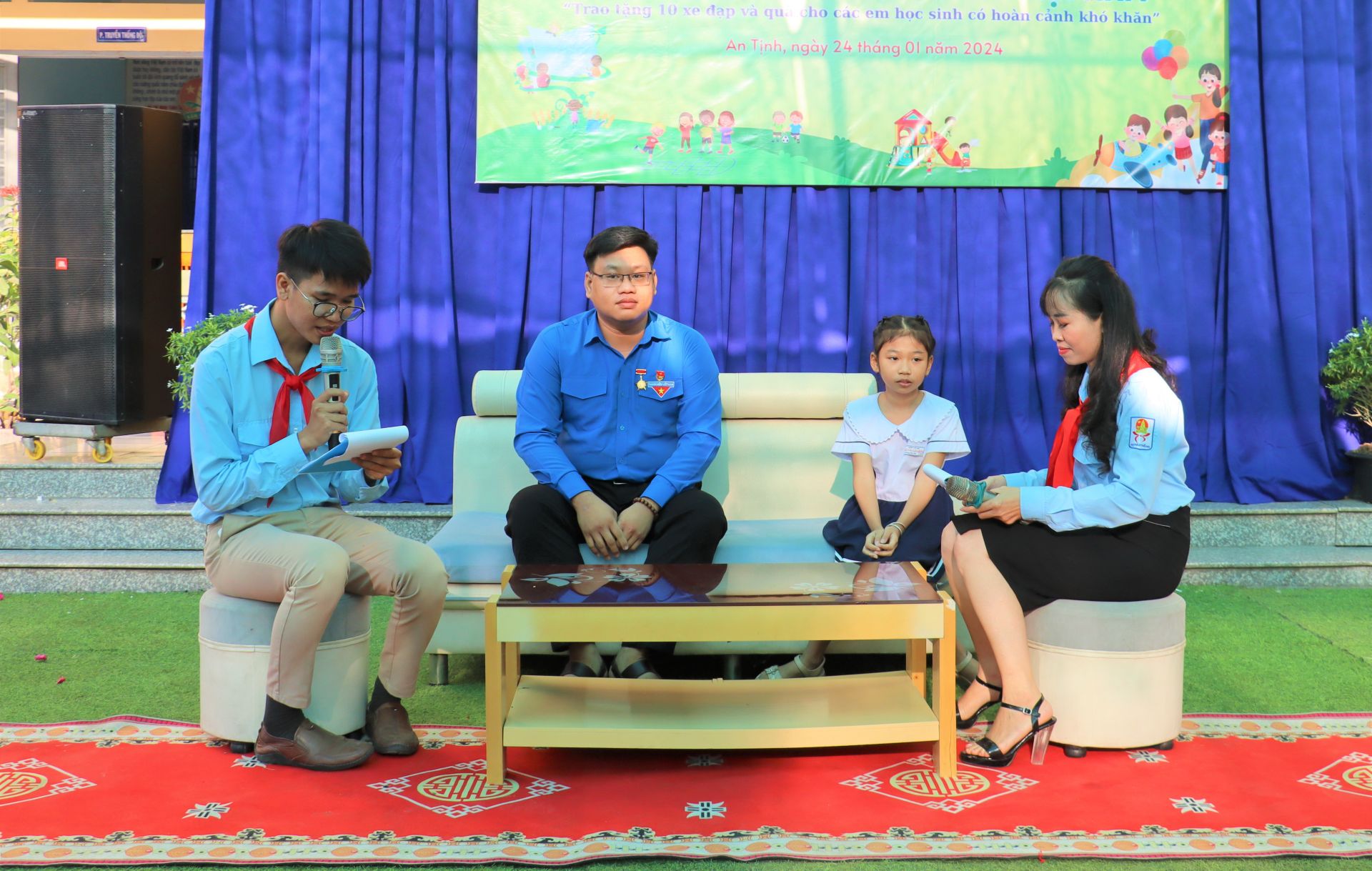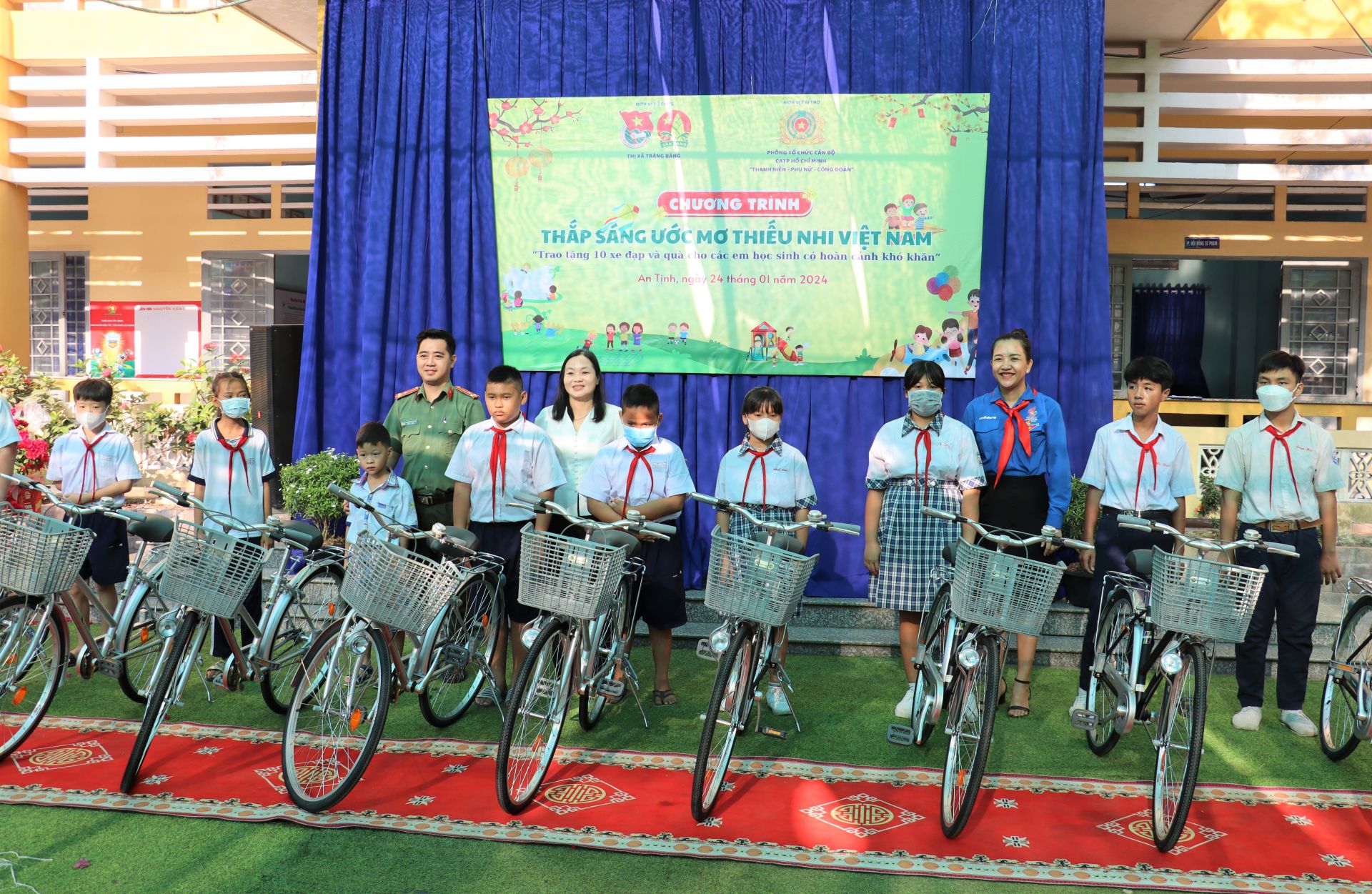 Nhằm chia sẻ những khó khăn, động viên học sinh có hoàn cảnh khó khăn tiếp tục vượt khó vươn lên trong học tập, rèn luyện, ban tổ chức đã trao tặng 10 chiếc xe đạp, 30 phần quà và 12 suất học bổng cho các em học sinh, đội viên trên địa bàn phường An Tịnh. Tổng kinh phí quà tặng 41 triệu đồng do Phòng Tổ chức cán bộ - Công an TP.HCM tài trợ.