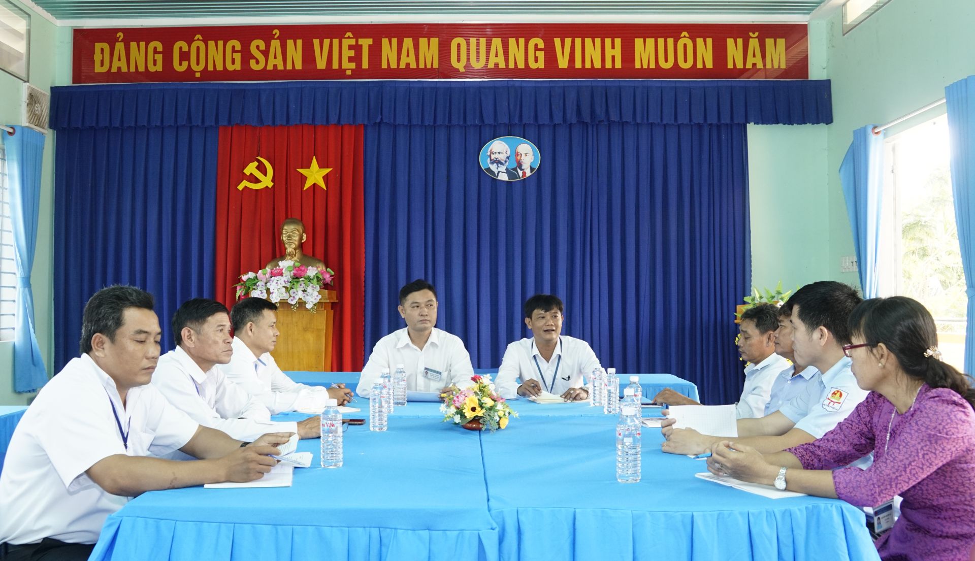 Thầy Sang (bên phải) chủ trì hội nghị giáo viên nhà trường.