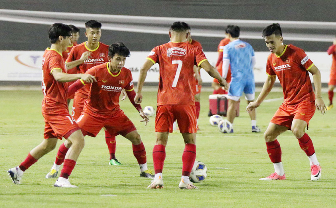Các cầu thủ đội tuyển Việt Nam khởi động kĩ lưỡng trong buổi tập luyện tối 31-8