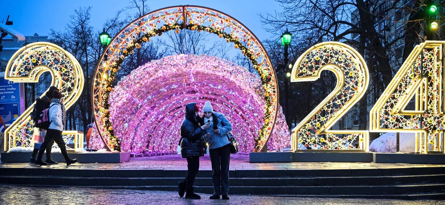 Người dân chụp ảnh trước đồ trưng bày trang trí đón năm mới 2024 ở trung tâm Moskva. Năm nay Nga tiếp tục tạm dừng các màn biểu diễn pháo hoa và hòa nhạc theo thông lệ tại Quảng trường Đỏ. (Ảnh: Sputnik).