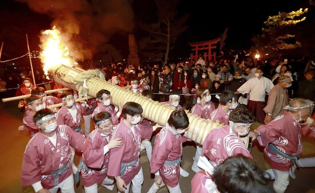 Lễ rước đuốc tại Đền Itsukushima ở thành phố Hatsukaichi, tỉnh Hiroshima, Nhật Bản, vào đêm giao thừa. (Ảnh: AFP)