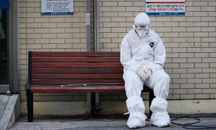 Nhân viên y tế nghỉ ngơi bên ngoài một bệnh viện ở Daegu hôm 23/2. Ảnh: AFP.