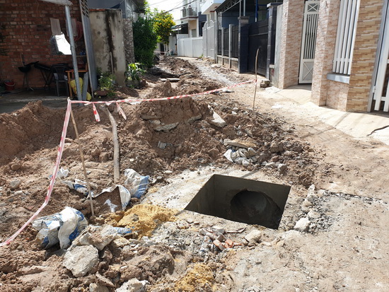 Chị N.T.T.N, người dân trong tuyến hẻm này cho biết, đơn vị thi công đào đất lên rồi chất đống giữa đường, cống cũng đã lắp đặt xong nhưng không cào xuống hoặc san phẳng mặt đường, khiến việc đi lại của người dân gặp khó khăn.