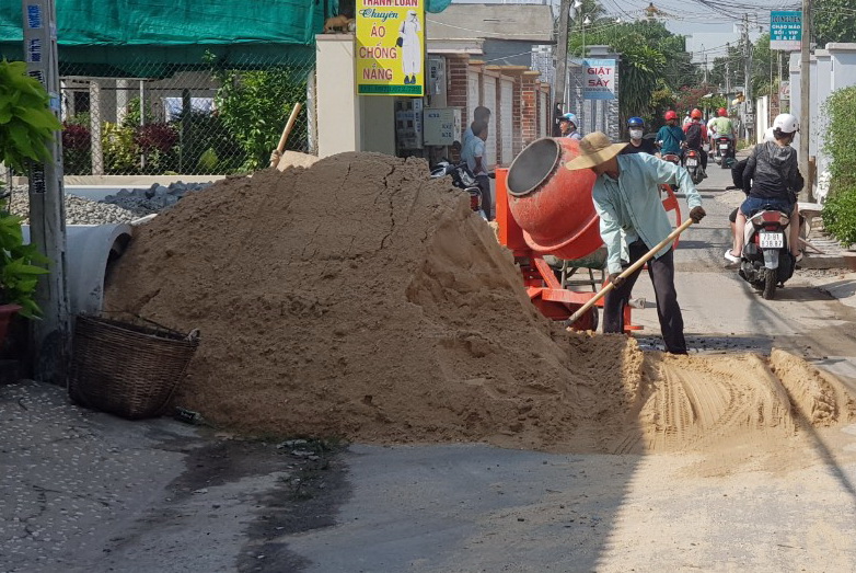 Đáng nói hơn, ngay giữa lòng đường vốn đã chật hẹp và xuống cấp, đơn vị thi công cho đặt máy trộn hồ hoạt động cạnh đống cát to đùng, chiếm gần hết lòng đường.