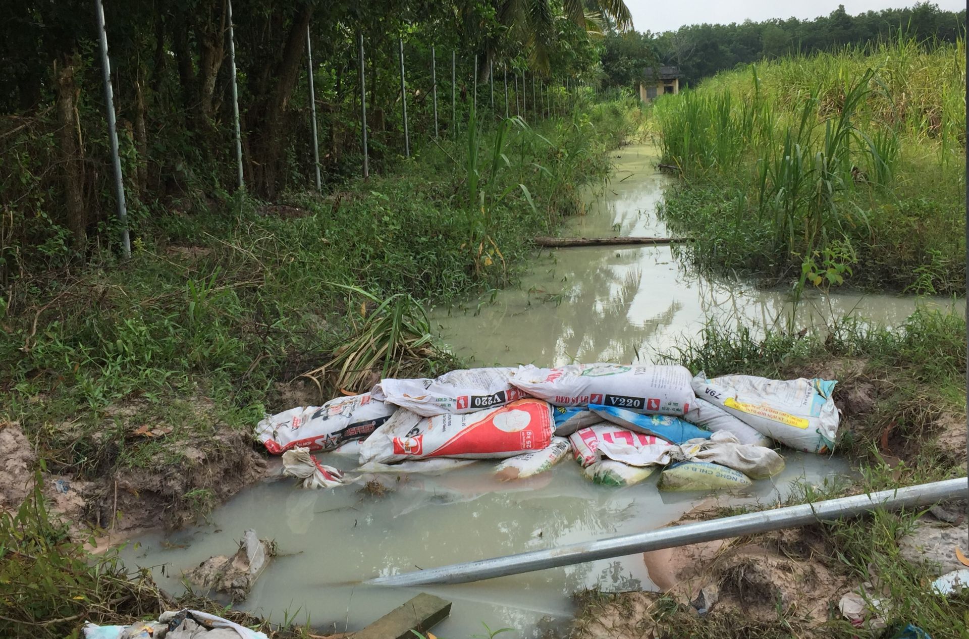 Cụ thể, đoạn kênh tiêu thoát nước tiếp giáp với hẻm 21 không có đê bao, khiến lượng nước mưa từ bãi mía đổ hết ra đường. Khi người dân phản ánh, Công ty khắc phục “cho có” bằng cách làm đê bao từ một vài bao cát. Vì cách khắc phục như vậy nên đã không ngăn được nước từ bãi mía tiếp tục đổ ra đường.