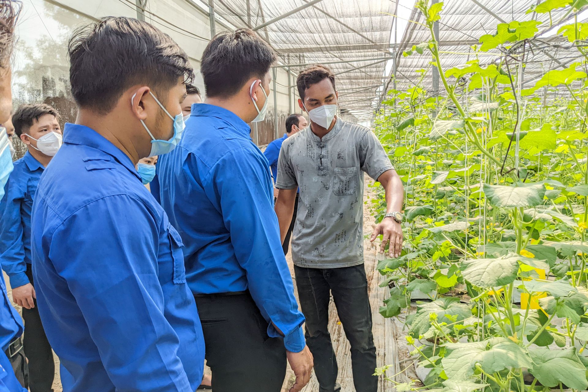 Cán bộ, đoàn viên, thanh niên được anh Phol Rid- Kỹ sư nông nghiệp hướng dẫn tham quan mô hình trồng dưa lưới.