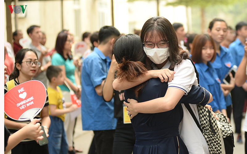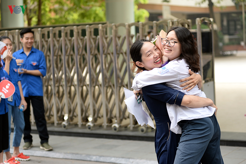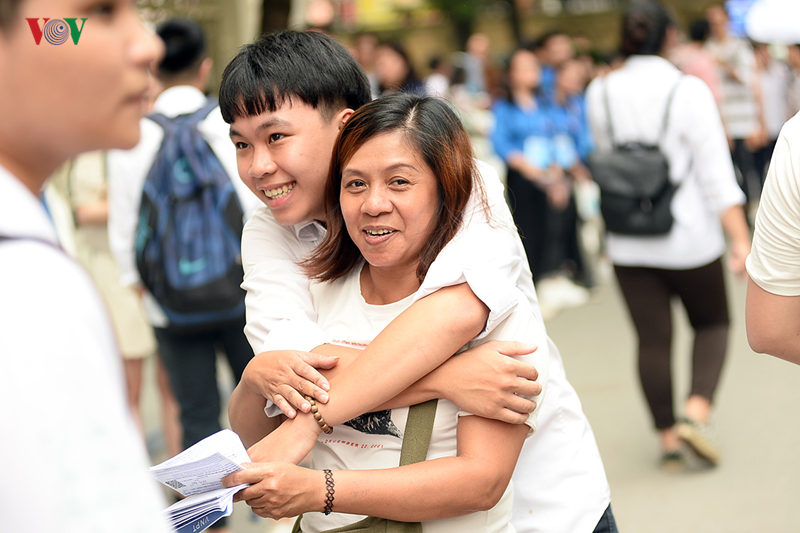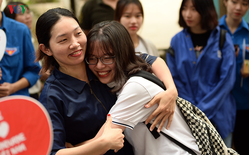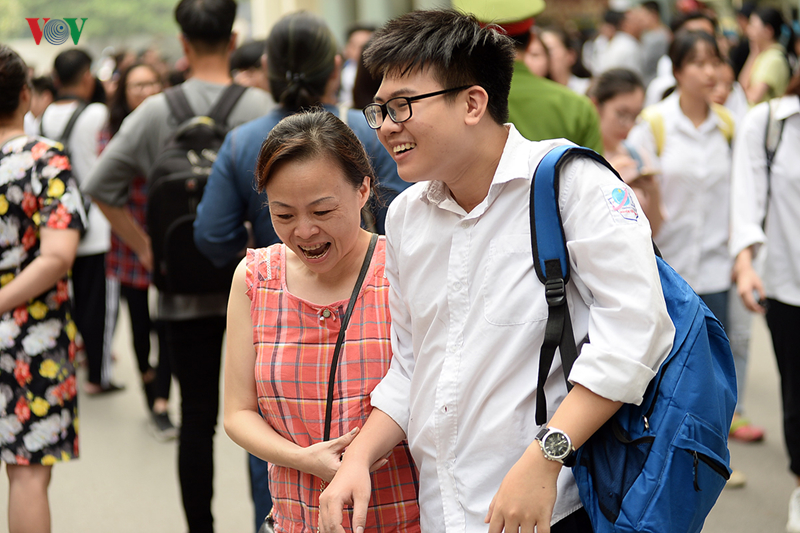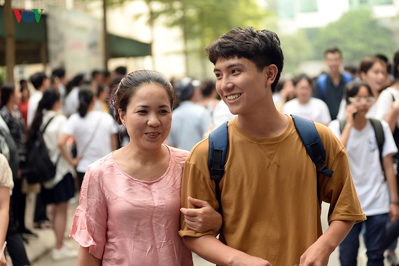 Tại điểm thi trường THPT Nguyễn Tất Thành (Cầu Giấy, Hà Nội), còn 20 phút trước khi hết giờ thi môn Văn, những thí sinh đã ra khỏi phòng thi với khuôn mặt vui mừng bên người thân.
