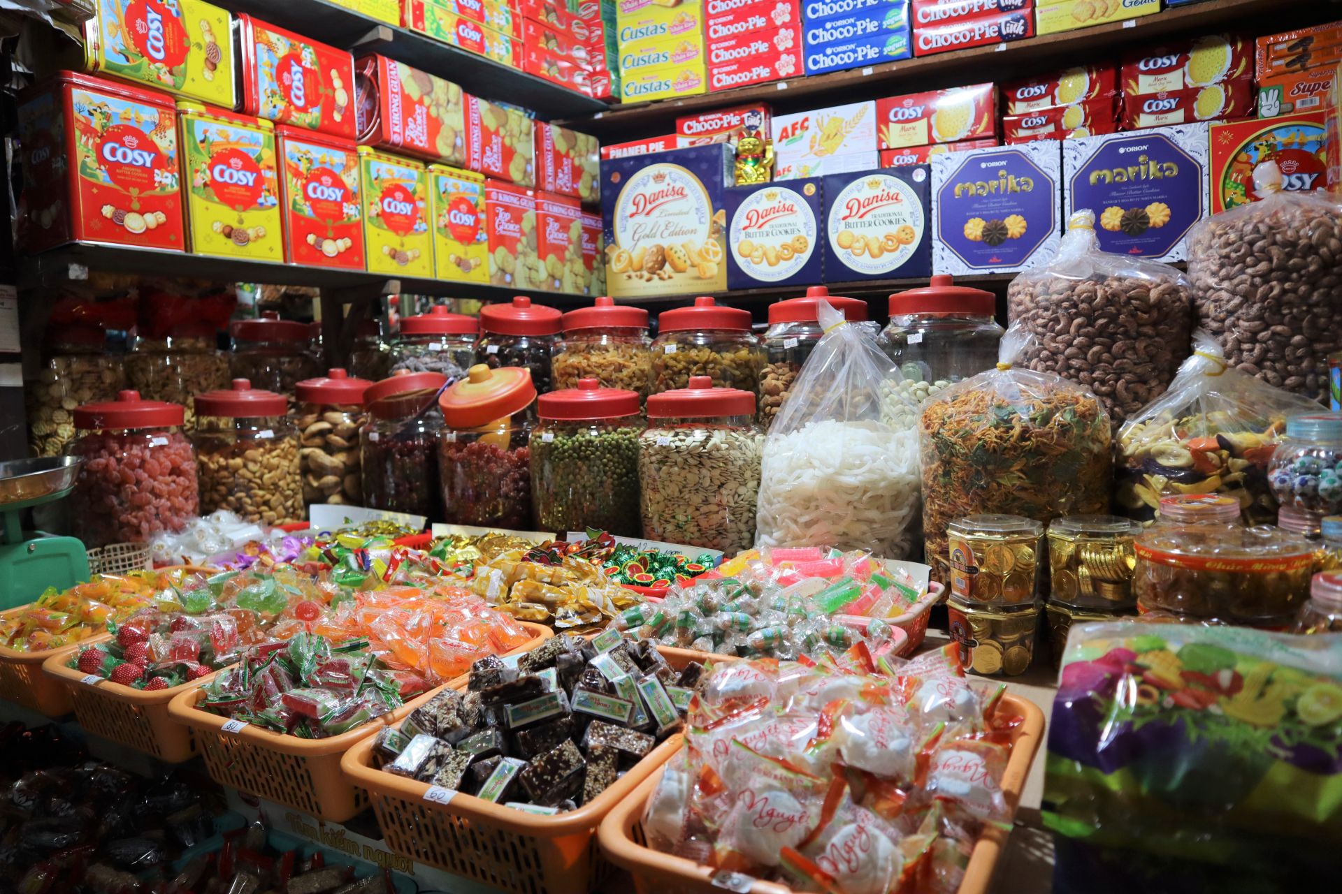 Một người dân mua bánh mứt tết tại chợ thành phố Tây Ninh.