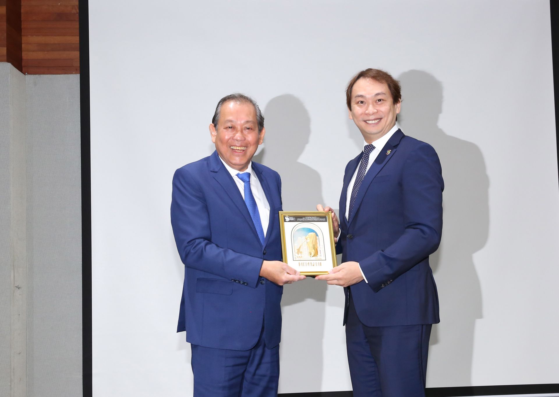 Đại diện Liên đoàn Sản xuất Singapore tặng lưu niệm cho Phó Thủ tướng Thường trực Trương Hòa Bình - Ảnh VGP/Lê Sơn