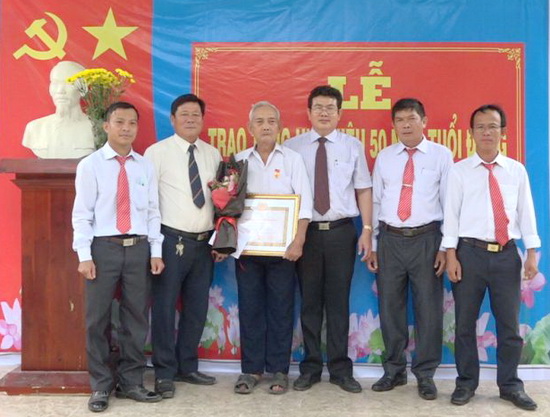 Sáng 29.9, tại xã Phước Bình, ông Hồ Văn Hồng-Phó Bí thư thường trực Thị uỷ Trảng Bàng cùng chính quyền địa phương đã đến trao tặng Huy hiệu 50 năm tuổi Đảng cho ông Võ Văn Dùm (SN 1945), thương binh 4/4, vào Đảng ngày 5.4.1971.