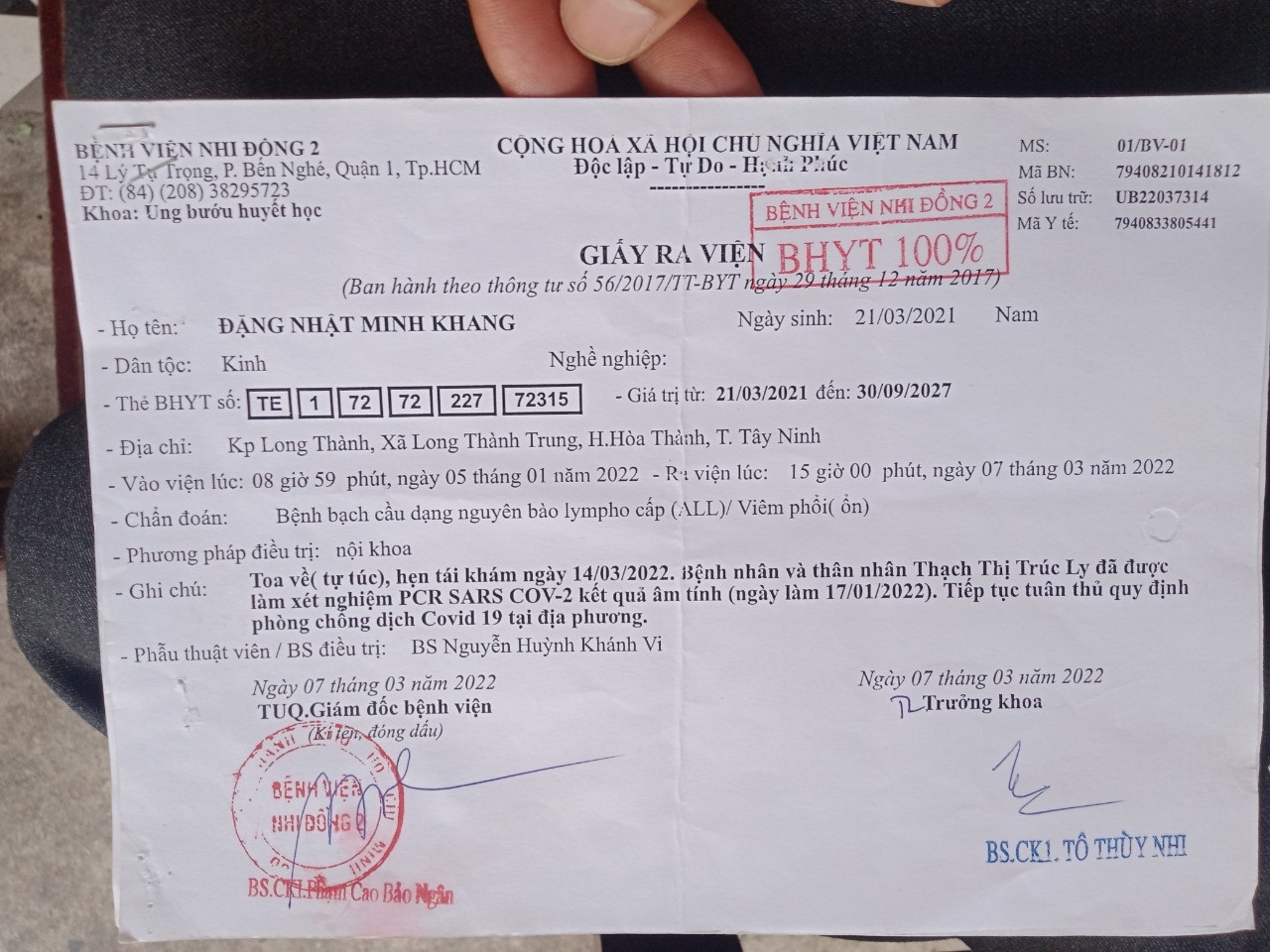 Chị Ly cho biết, cháu Khang lúc mới sinh khỏe mạnh như bao đứa trẻ khác, được 9 tháng tuổi (tháng 12.2021) cháu phát bệnh, gia đình đưa cháu khám ở bệnh viện Nhi Đồng 1, bác sĩ chẩn đoán bệnh ung thư máu. Đến ngày 5.1.2022 cháu nhập viện Nhi Đồng 2, kết quả xét nghiệm cháu Khang bị bệnh bạch cầu, điều trị đến ngày 7.3.2022 xuất viện, đến 20.6.2022 cháu nhập viện tiếp, bác sĩ chẩn đoán bị nhiễm trùng máu, và điều trị đến ngày 18.7.2022 xuất viện. Mỗi lần nhập viện điều trị kéo dài hơn tháng, về nhà 1, 2 tuần lại nhập viện. Lần xuất viện gần đây nhất là ngày 11.10.