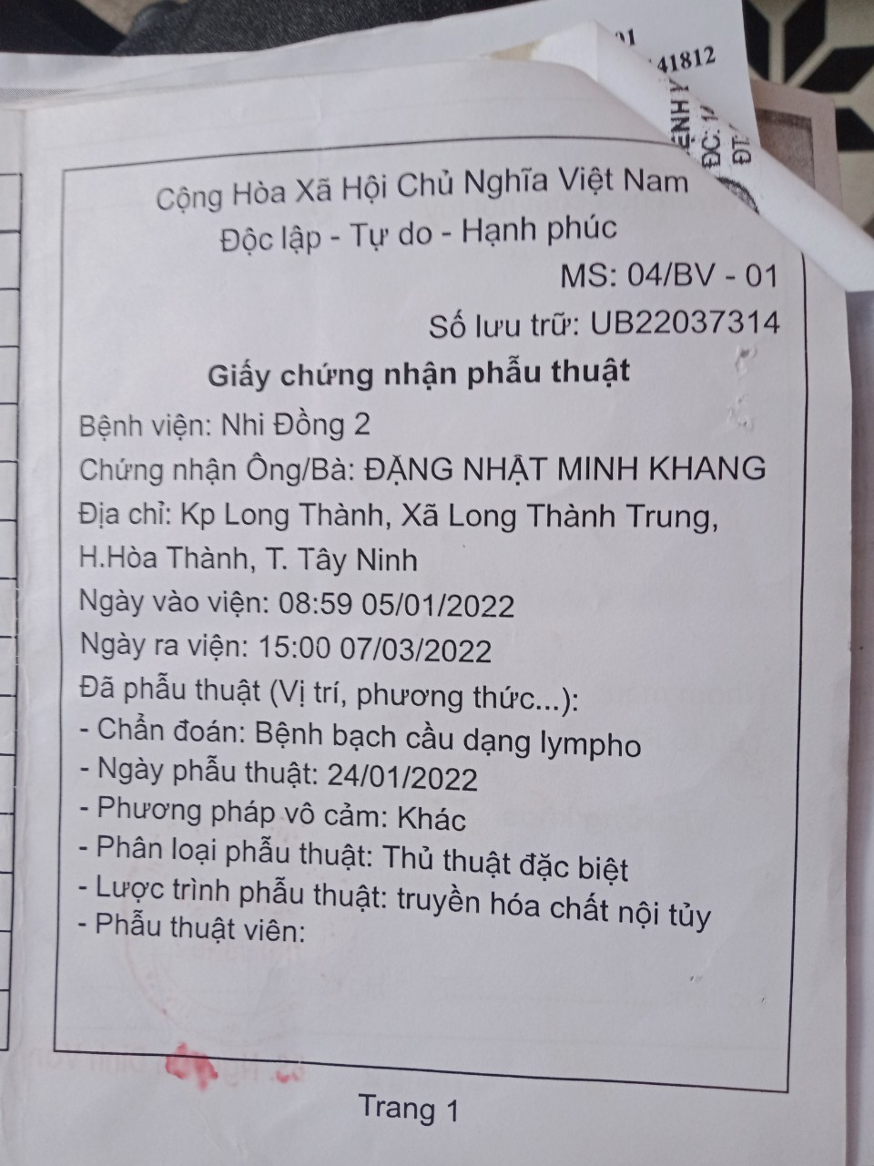 Con thứ hai của anh chị là cháu Đặng Nhật Minh Khang (sinh năm 2021), bị bệnh bạch cầu dạng nguyên bào lympho cấp và viêm phổi đã hơn một năm. Hoàn cảnh gia đình anh chị rất khó khăn, cả 2 vợ chồng làm thuê, thu nhập bấp bênh. Từ khi cháu Khang bệnh, chị Ly phải nghỉ làm để vào bệnh viện chăm sóc cháu. Kinh tế gia đình hiện rất khó khăn.