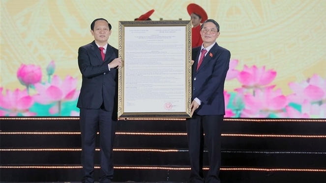 Phó Chủ tịch Quốc hội Nguyễn Đức Hải trao Nghị quyết của Ủy ban Thường vụ Quốc hội cho Đảng bộ, chính quyền thị xã Quế Võ và các phường thuộc thị xã Quế Võ (Ảnh: Nguyên Thành)