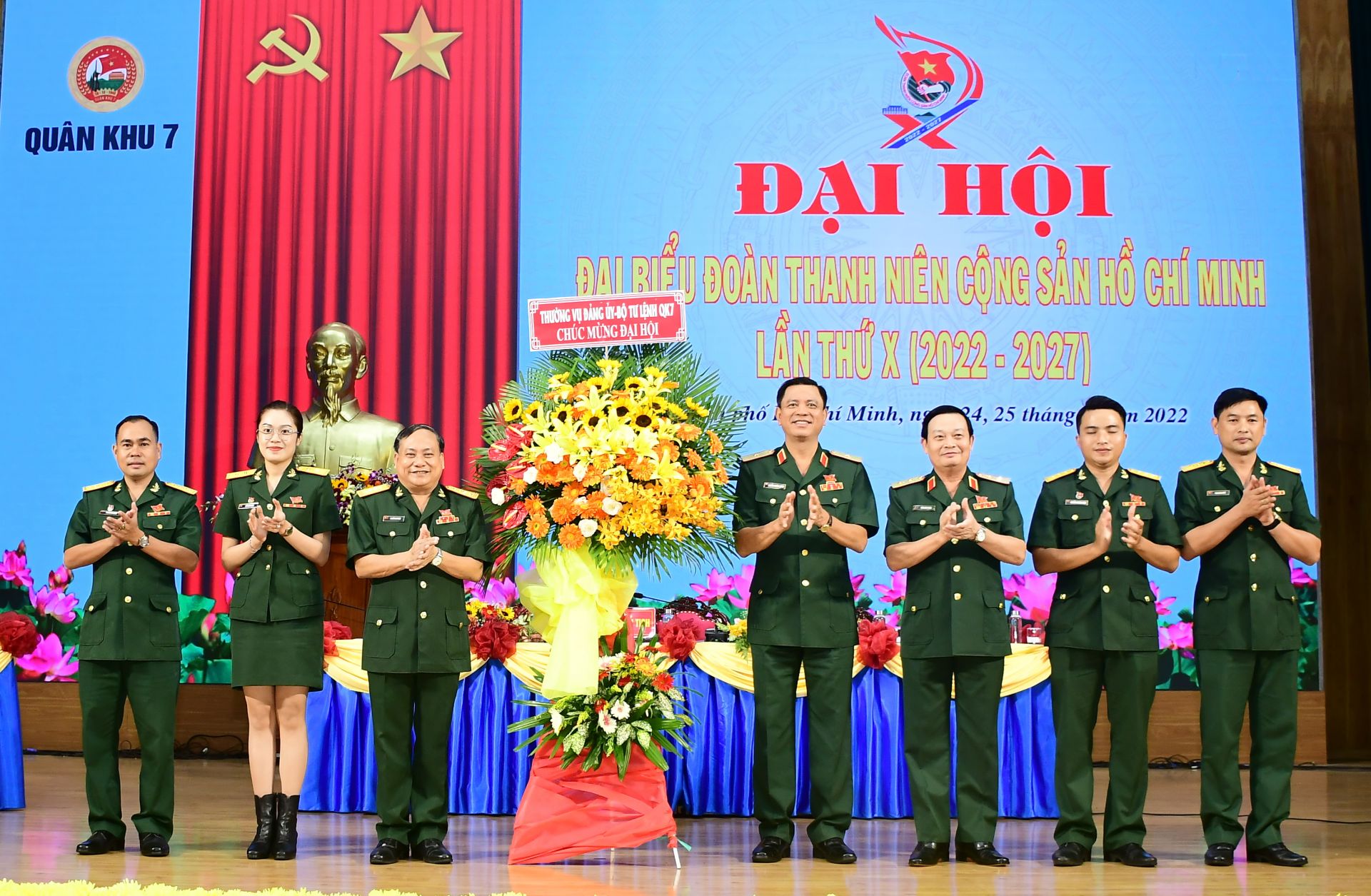 Thiếu tá Hoàng Đức Danh (bìa trái) tham gia Đoàn chủ tịch Đại hội đại biểu Đoàn Thanh niên Cộng sản Hồ Chí Minh LLVT Quân khu 7, lần thứ X (2022 - 2027).