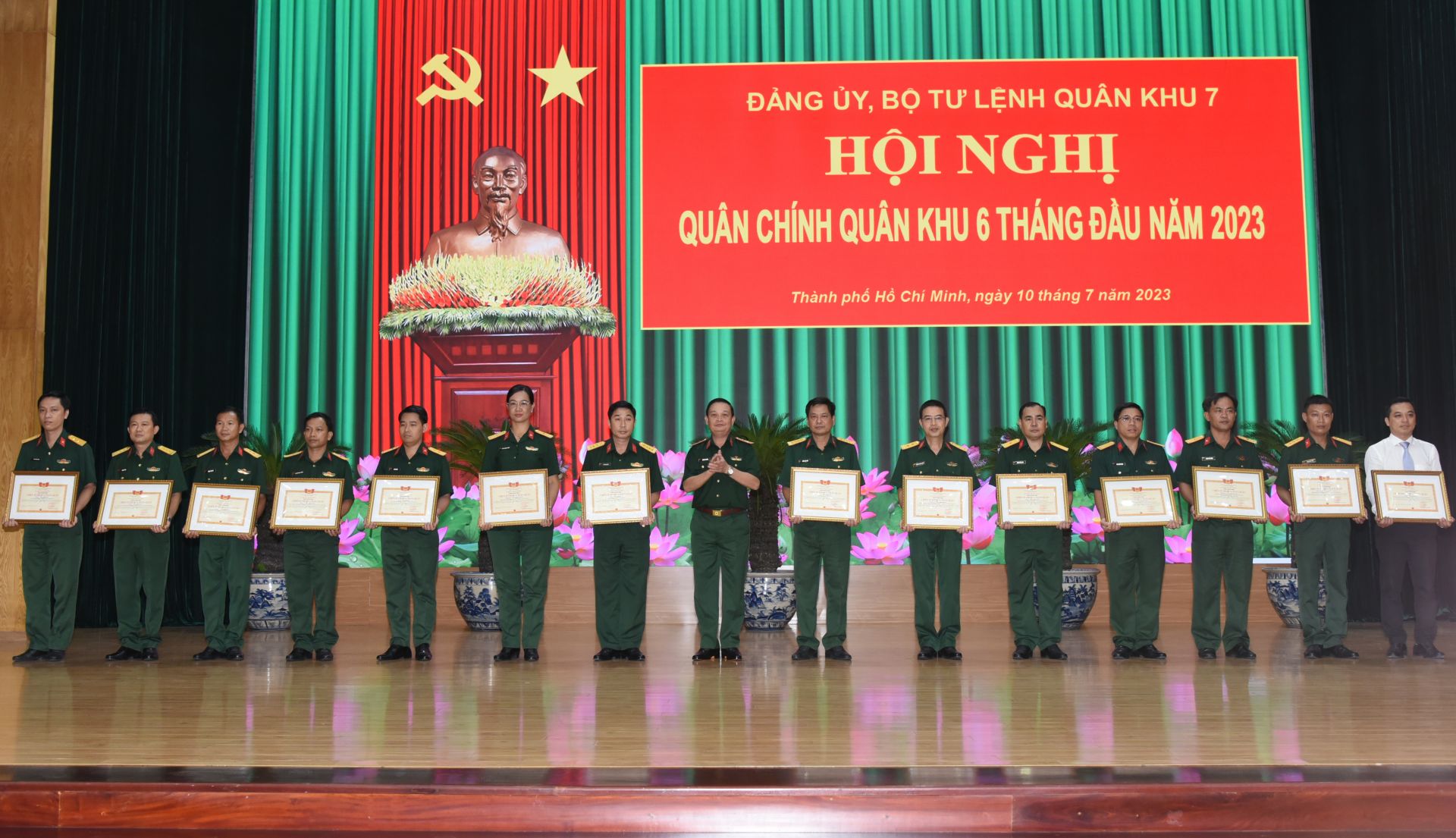 Thừa uỷ quyền của Bộ trưởng Bộ Quốc phòng, Trung tướng Trần Hoài Trung- Chính uỷ Quân khu 7 trao danh hiệu Chiến sĩ thi đua toàn quân năm 2022 cho Thiếu tá Hoàng Đức Danh (đứng thứ 5 từ phải qua) tại Hội nghị quân chính Quân khu 6 tháng đầu năm 2023.