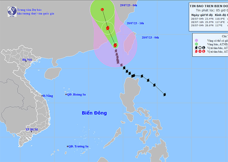 Theo Trung tâm Dự báo khí tượng thủy văn Quốc gia, hồi 4 giờ ngày 28/7, vị trí tâm bão ở vào khoảng 23,4 độ Vĩ Bắc; 118,9 độ Kinh Đông, cách Phúc Kiến (Trung Quốc) khoảng 120km về phía Nam Đông Nam. Sức gió mạnh nhất vùng gần tâm bão mạnh cấp 13-14 (134 - 166km/giờ), giật cấp 16.