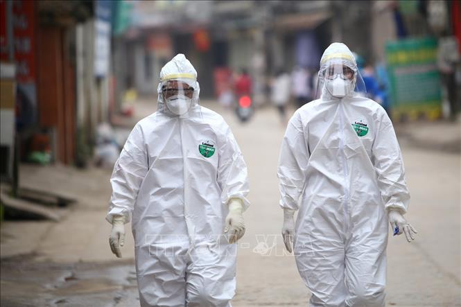 Nhân viên y tế trong đồng phục bảo hộ thực hiện nhiệm vụ tại thôn Hạ Lôi (Mê Linh, Hà Nội). Ảnh: Minh Quyết/TTXVN