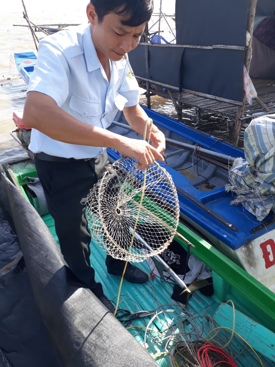 Thành viên lực lượng chức năng kiểm tra bến cá trong hồ Dầu Tiếng.