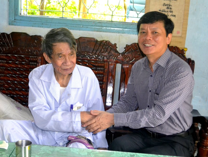 Thứ trưởng Bộ LĐTB&XH Nguyễn Trọng Đàm thăm hỏi sức khỏe Anh hùng LLVTND Mười Thương. |