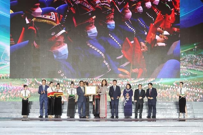 Thứ trưởng Bộ Văn hoá, Thể thao và Du lịch Hoàng Đạo Cương đại diện Bộ VHTT&DL đón nhận Bằng của UNESCO ghi danh “Nghệ thuật Xòe Thái” từ bà Pauline Tamesis, Điều phối viên thường trú của Liên hợp quốc tại Việt Nam. Ảnh: Dương Giang/TTXVN