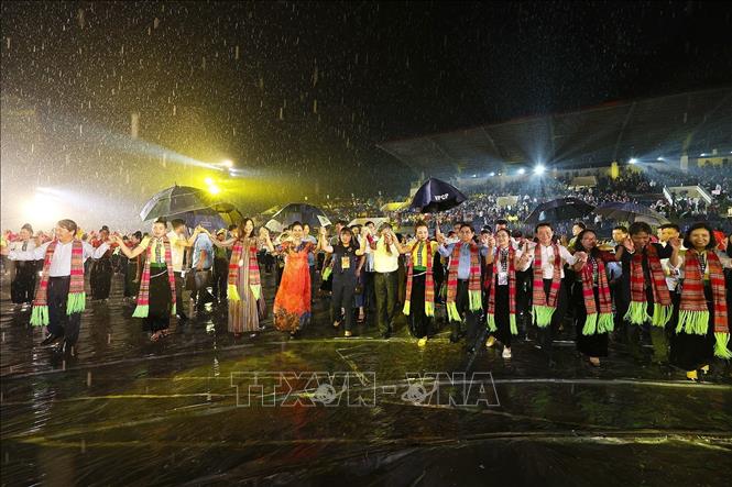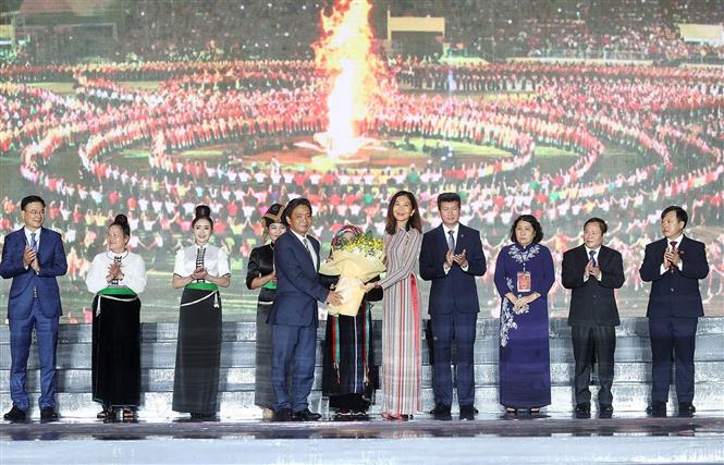 Màn trình diễn nghệ thuật Xòe Thái với sự tham dự của 3.000 diễn viên, nghệ nhân và học sinh tại buổi lễ. Ảnh: Tuấn Anh/TTXVN