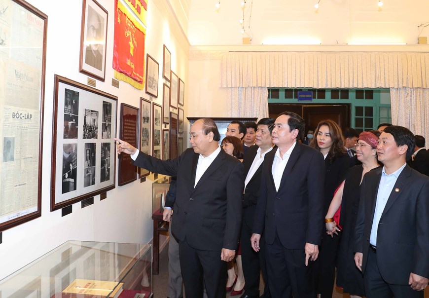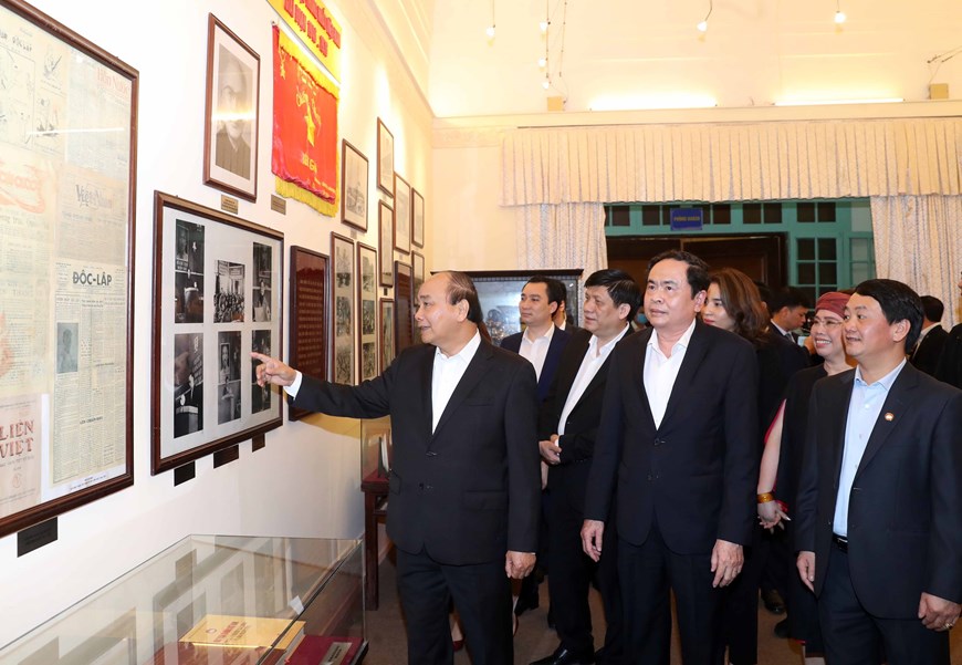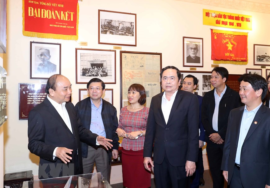 Thủ tướng Nguyễn Xuân Phúc cùng các đại biểu đến thăm Phòng truyền thống của Ủy ban Trung ương Mặt trận Tổ quốc Việt Nam. (Ảnh: Thống Nhất/TTXVN)