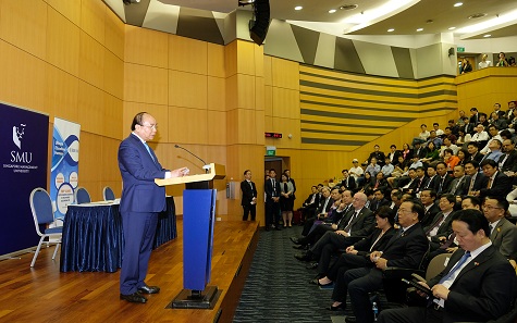 Phát biểu tại giảng đường Đại học Quản lý Singapore (SMU), một trong những đại học công hàng đầu Singapore, Thủ tướng Nguyễn Xuân Phúc bày tỏ tin tưởng rằng, “trong một ngày không xa, rất nhiều gương mặt trẻ ngồi kia sẽ là chủ tịch, tổng giám đốc điều hành các doanh nghiệp Việt Nam tầm cỡ khu vực, quốc tế, kể cả ở Singapore”.